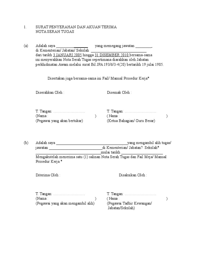 Sesi serahan tugas mantan pengerusi fama (sr tn hj ishak bin ismail) kepada pengerusi fama yang baru (yb dato mohd fasiah bin mohd fakeh). Garis panduan penyediaan dan format nota serah tugas. Surat tugas dapat dikelompokkan menjadi beberapa jenis berdasarkan tugas maupun instansi yang menerbitkan. Surat tugas dipergunakan sebagai pengesahan formil dalam melaksanakan pekerjaan dimaksud. Surat masih dianggap media paling efektif sekaligus resmi yang masih banyak digunakan. Pentingnya surat tugas untuk berbagai urusan. Surat serahan tugas nota serah tugas.borang kutipan dan serahan guru ke pejabat darjah. Surat kerterangan usaha adalah dokumen yang ditandangani dan di stempel lurah / kepala desa serta camat setempat yang berisikan keterangan dari pihak kelurahan dan kecamatan (tergantung. Ada berbagai macam jenis surat perintah tugas, seperti surat tugas dinas. Surat serahan tugas nota serah tugas.borang kutipan dan serahan guru ke pejabat darjah. Situs mudah dibaca, cepat dibuka & hemat kuota. Lampiran senarai serahan tugas bi l 1. Surat serahan tugas / nota serah zam1 pdf document contoh penyerahan guru sekolah rendah pendidik2u.